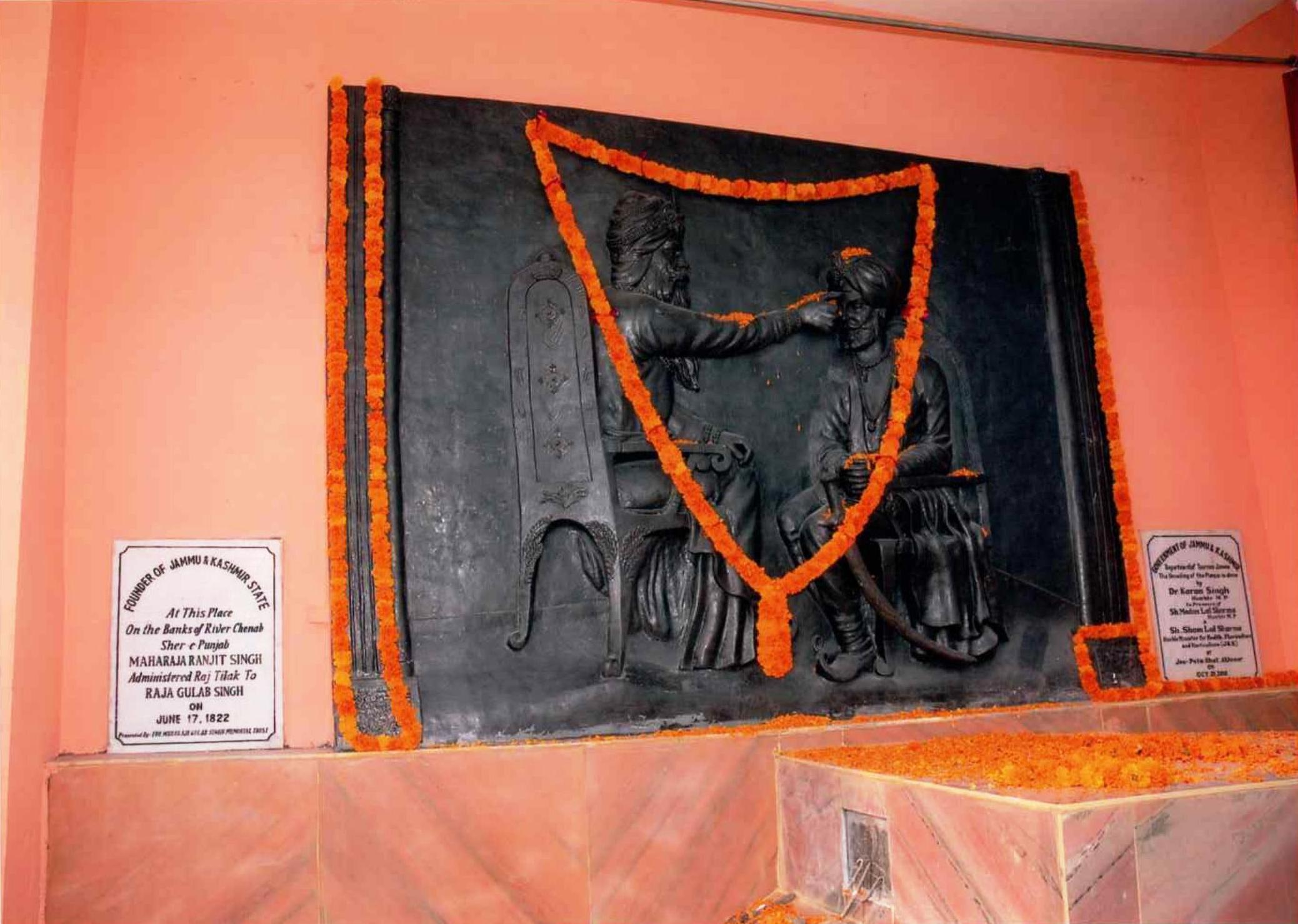 For his meticulous and loyal services which Gulab Singh rendered for the solidarity, integrity and the stability of the Sikh state, he received remarkable appreciation by Maharaja Ranjit Singh. On June 17, 1822 Maharaja Ranjit Singh bestowed Gulab Singh the title of ‘Raja’. Maharaja Ranjit Singh personally applied the tilak on his forehead from top to bottom, which was symbolic of the long reign period of the Dogra rulers. The ceremony was performed at the historic JiaPota tree on the bank of Chenab at Akhnoor fort.